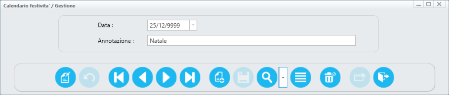 In questa procedura è possibile inserire le date indicanti le festività. Per le festività ricorrenti ogni anno allo stesso giorno e mese occorre inserire l' anno con il valore di 9999, nel caso contrario occorre indicare il valore del giorno, mese e anno della festività.
