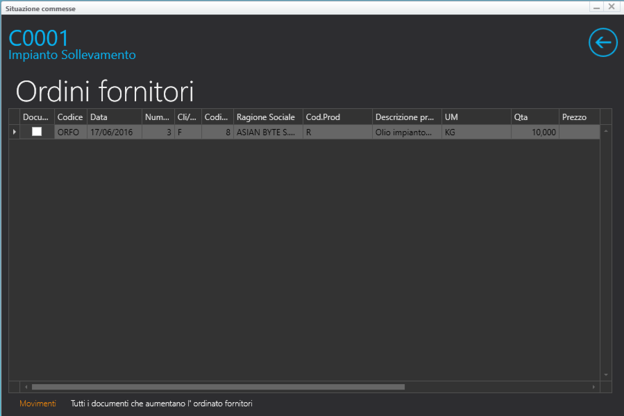 Dettagli dei movimenti di magazzino effettuati sulla commessa