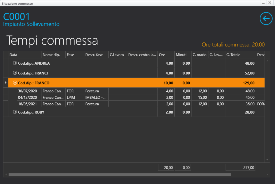 Visualizza l' elenco dei dei tempi di produzione della commessa registrati in contabilità industriale.