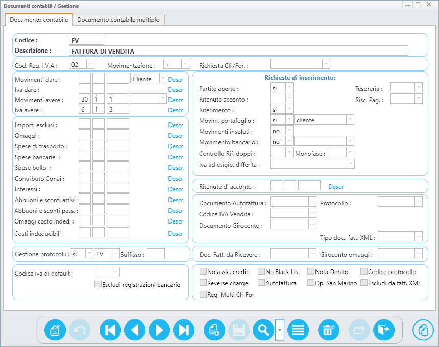 se il documento deve gestire i protocolli come per esempio le fatture di acquisto e di vendita, settare SI e indicare il codice del protocollo che deve essere gestito.