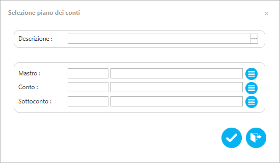Permette di ricercare un conto del piano dei conti tramite descrizione, mastro, conto, sottoconto. Il conto selezionato verrà inserito nella corrente riga selezionata (sezione prima nota). I bottoni "Lista" visualizzati dopo la descrizione del mastro, conto e sottoconto permettono rispettivamente di visualizzare la lista dei mastri, conti e sottoconti.